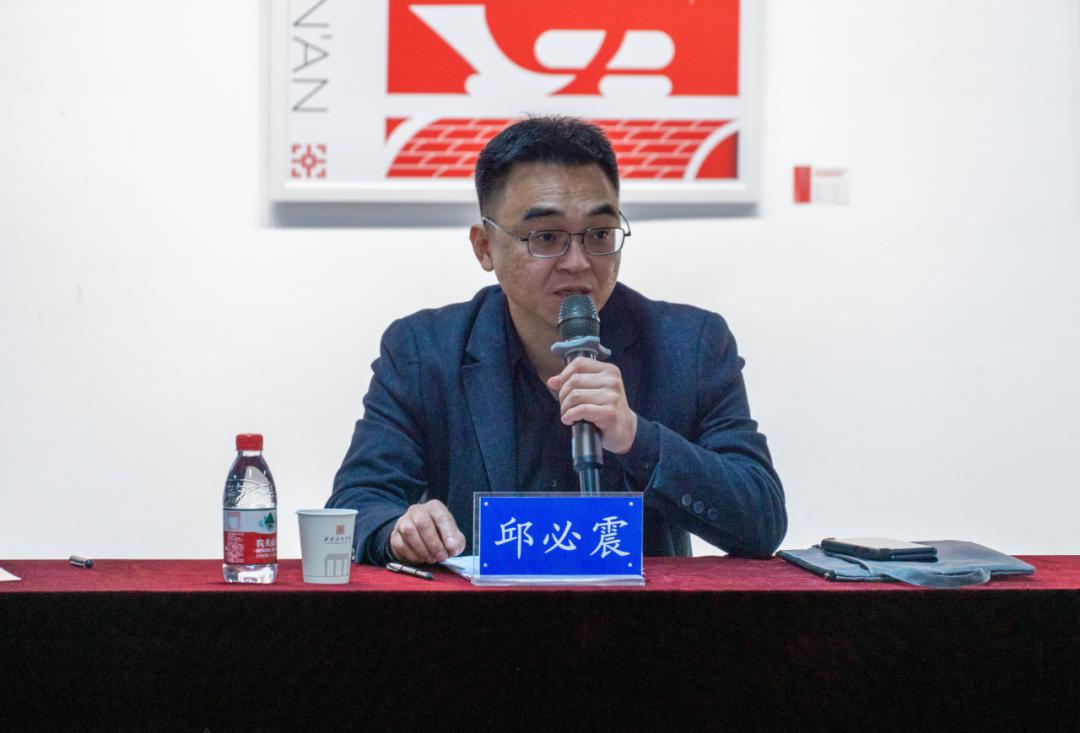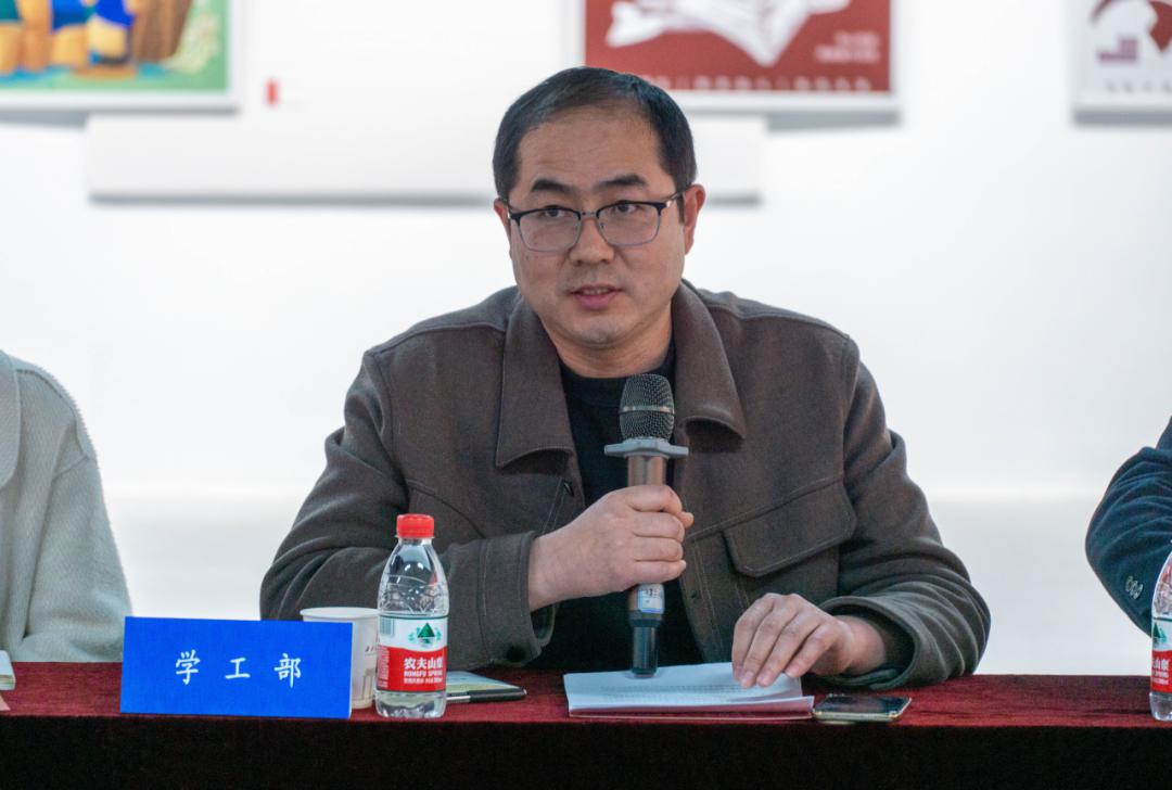 邱必震在讲话中表示,艺术与思想政治教育的协同育人是培养新时代艺术人才的关键,强调艺术创作要传递思想价值。从三个“更重要”提到具体措施,一是方向比速度更重要,必须筑牢学院的红色根基;二是融合比形式更重要,通过视觉语言重构政治话语,让社会主义核心价值观可触可感,使家国情怀在设计中直抵人心;三是队伍比硬件更重要,要强化“专业导师+思政导师+技术导师”三支队伍建设。最后,他提出三点希望:植根文化自信,从丰富的历史和文化遗产中汲取力量与灵感;回应时代命题,解决当下社会面临的挑战与问题;不断探索创新的表达方式,用新颖独特的视角推动思政与艺术的融合。