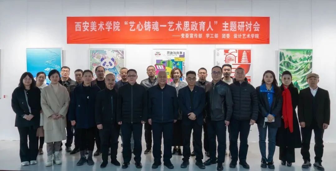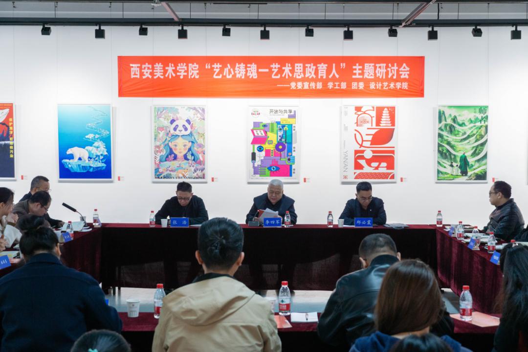 2025年3月18日下午,由西安美术学院党委宣传部、学工部、团委主办,设计艺术学院党委策划举办的思政主题设计作品展暨“艺心铸魂—艺术思政育人”主题研讨会在美术馆B馆2楼召开。学院党委副书记李四军、邱必震、党委委员、副院长张浩出席研讨会,党委宣传部、学工部、团委、教务处以及各院系负责人,辅导员代表、学生代表参加会议,会议由设计艺术学院党委书记王山主持。