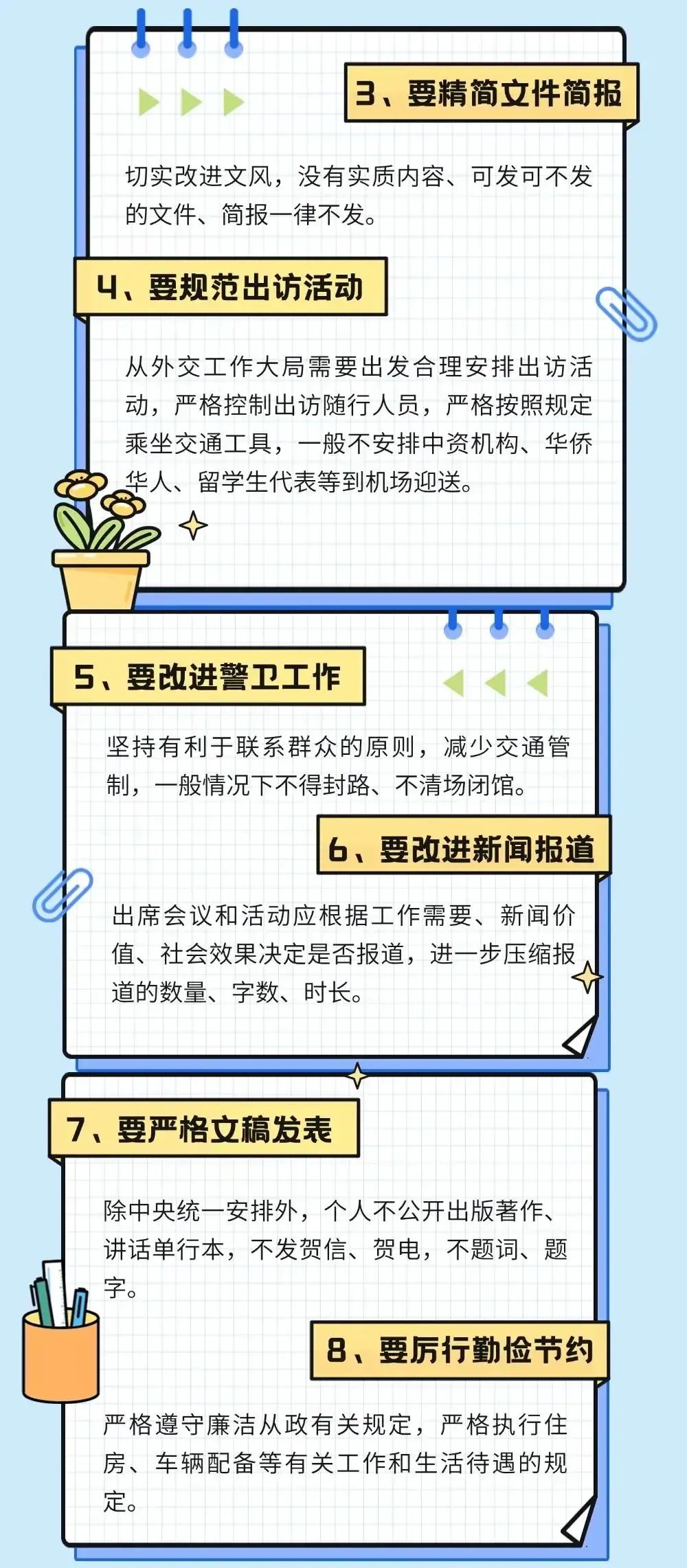 中央八项规定精神是推进作风建设的重要指引,与我们的工作、学习、生活息息相关。自2012年实施以来,中央八项规定以“小切口”推动“大变局”,从精简会议活动到规范公务接待,从厉行勤俭节约到改进调查研究,每一项都直击作风建设要害。本期推文将通过清晰的图文解析,带领大家了解中央八项规定的具体内涵,并列举常见违规表现,以直观的方式明晰纪律红线。