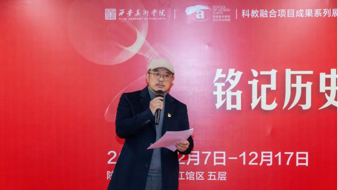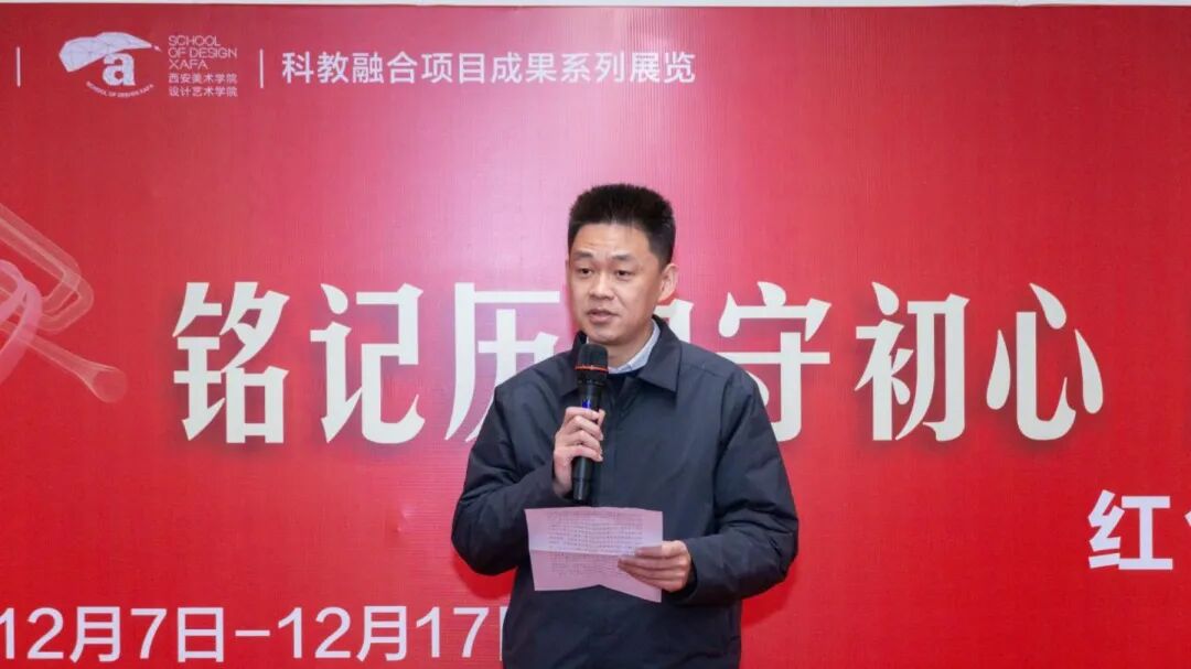 随后,设计艺术学院党委书记王山对陕西省文化馆的大力支持表示感谢,他强调:本次展览是西安美术学院科教融合项目成果系列展览之一,展出的作品有对中国人民抗日战争暨世界反法西斯战争胜利80周年的深情纪念与缅怀,有对延安精神、长征精神的时代诠释,还有对革命文物、不可移动革命旧址的创意转化,每一件作品都是师生将家国情怀融入设计创作的结晶,让红色文化不再是遥远的记忆,而是转化可感知、可传播、可深化的设计语言,希望通过展览能让更多观众感受红色文化和设计艺术的碰撞,让爱国主义精神在潜移默化中浸润心灵。
