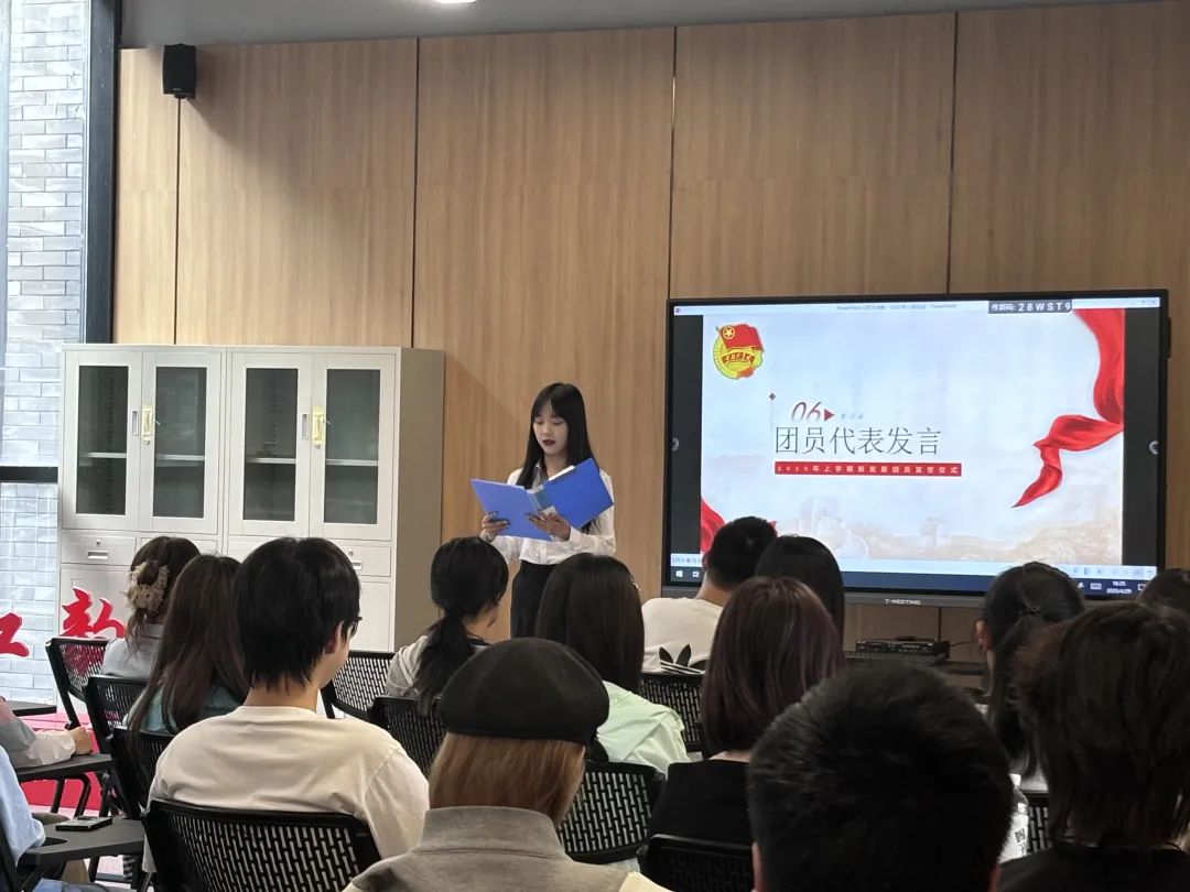 毛子行同学作为老团员代表,向新团员致以热烈祝贺与欢迎,强调共青团是锤炼意志、践行信仰的先进集体,号召每位团员以赤诚之心报效祖国、以进取之心精进学业、以坚定之心迎接挑战。同时她结合自身参与团课学习、主题团日的成长经历,勉励新老团员高扬青春风帆,用行动诠释誓言,为团组织、学校与社会贡献青春力量,赓续新时代的使命荣光。