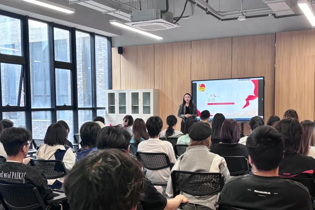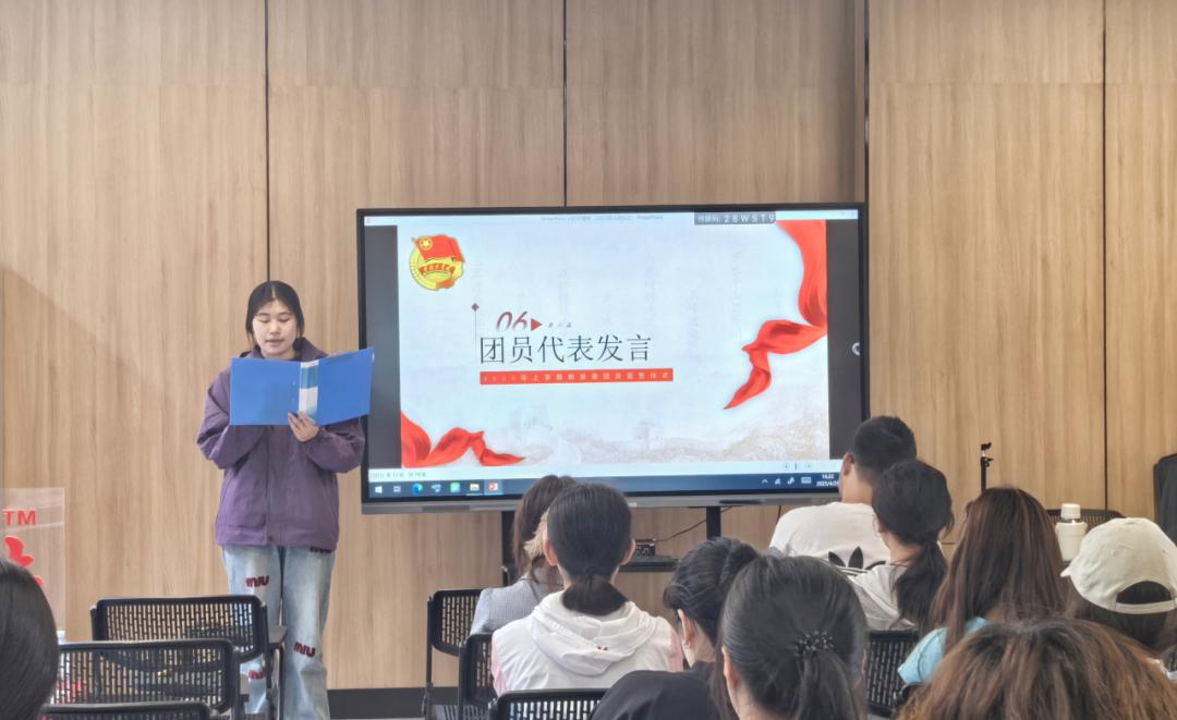设计艺术学院团总支书记马雯雯对新团员表示热烈的祝贺,并对全体团员提出殷切希望。她希望大家能做“三有”共青团员:一要做有根的青松,深扎理想信念之土。把入团誓词作为终身必修课,在党史团史学习中铸魂,把个人理想融入国家发展的大局中。 二要做有光的火炬,燃烧奋斗担当之焰。积极参与志愿服务、乡村振兴等实践,用专业知识服务社会。三要做有度的尺规,恪守纪律规矩之界。严守团章要求,主动向党组织靠拢,在日常生活学习中争做表率,展现新时代团员清朗昂扬的精神风貌。