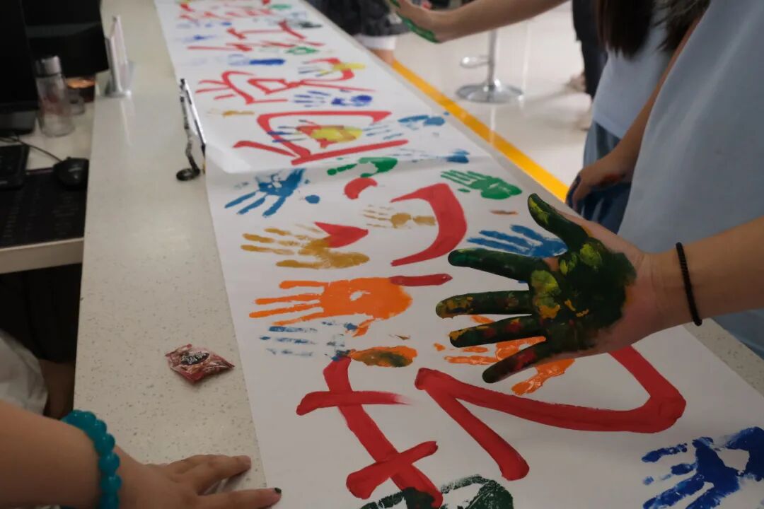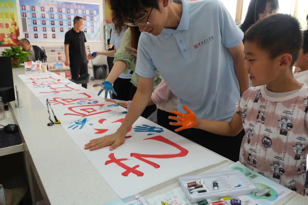 大家移步至服务中心前的广场,共同参与 “手印寄初心” 仪式。在团队成员绘制的“艺心向党,红韵宜川” 主题横幅前,孩子们和团队成员一起将五颜六色的手掌印按压在横幅上。一个个错落有致的手印交织成一幅寓意深刻的图案,既体现了孩子们与团队成员的紧密联结,更是艺术与推动宜川县域文化发展结合的生动展示。