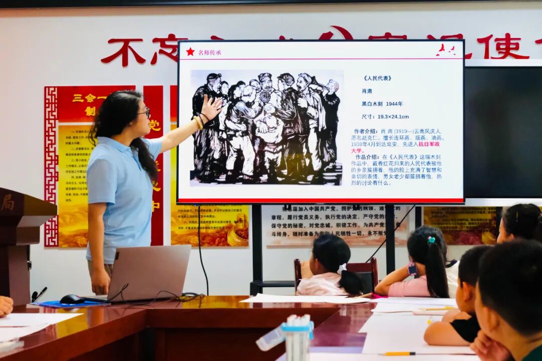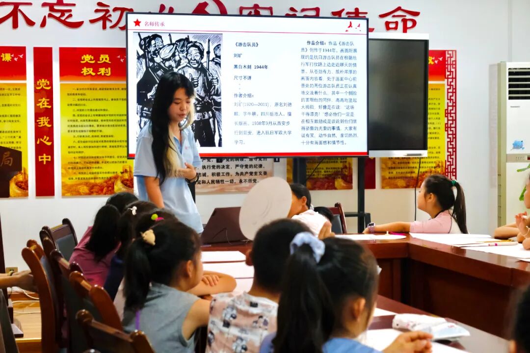 一大早,团队走进中山街社区党群服务中心,为这里的小朋友们带来了一堂别开生面的红色美育小课堂。活动伊始,团队成员以《卫我中华,吾国有我》为题展开演讲。生动的讲述中,既有对国防重要性的深刻阐释,也有对当下幸福生活来之不易的真切感慨,字里行间满是对孩子们的殷切期望——愿他们勤勉向学,未来能以己之力报效祖国,真挚的情感令人动容。随后,《一画一课》美育小课堂正式开启。团队与孩子们一同赏析了四幅红色艺术作品,涵盖国画、木刻版画等多种形式。从画面中,大家仿佛看到了抗战岁月的艰难卓绝,也感受到了新中国建设的蓬勃力量。团队希望通过这样的绘画赏析与美育熏陶,在孩子们心中悄悄播下热爱祖国的种子。