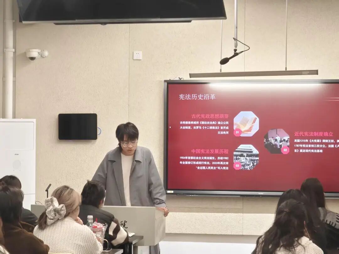 随后,伍昱达同学围绕“宪法的核心要义”“公民的权利与义务”“青年在法治社会中的责任”三大板块展开讲解。他将抽象的宪法条款转化为生动的故事:从革命年代宪法精神的萌芽,到新时代宪法与时俱进的修订,一个个鲜活案例让枯燥的理论变得可感可知。