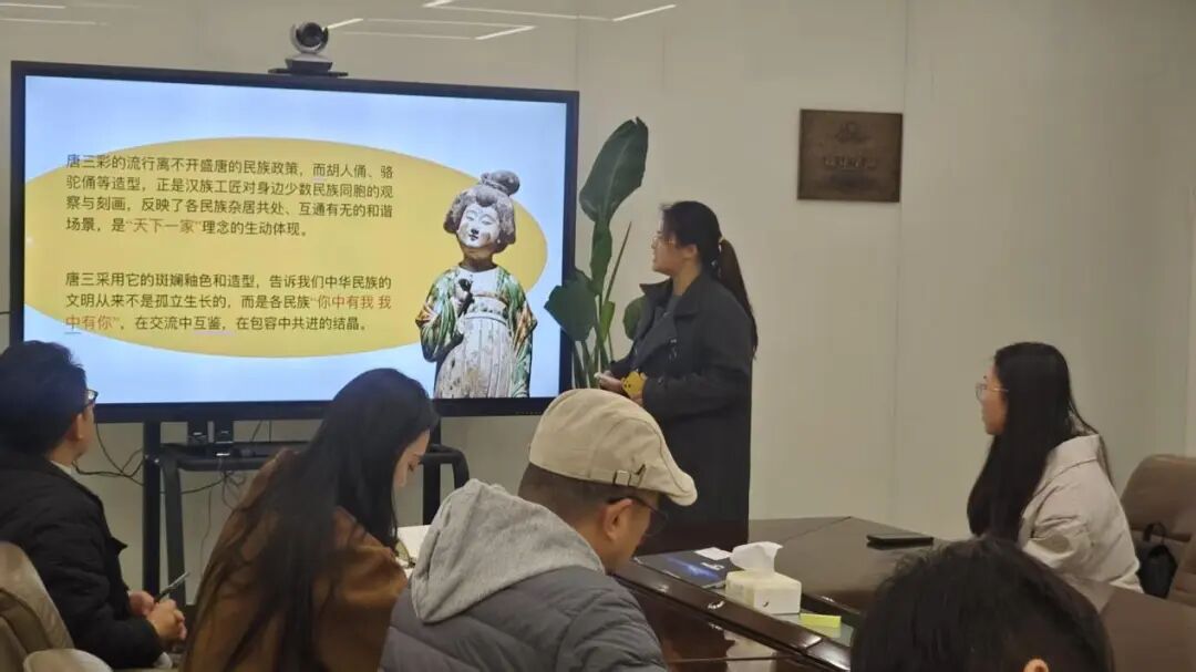 会上,学生代表们带来了精彩纷呈的分享:刘奕围绕宝相花的文化演变,展现多民族文化的深度融合;周子玥以唐三彩为载体,解读丝路文化交流的历史印记;徐俊驰、王禹皓则通过青铜器文创产品设计,探索传统文化现代表达的创新路径。朝鲜族学生尹世镐结合成长与求学经历,分享了民族文化记忆与跨民族同窗情谊,表达了以创作搭建民族交流桥梁的决心,真挚的感悟引发在场师生共鸣。