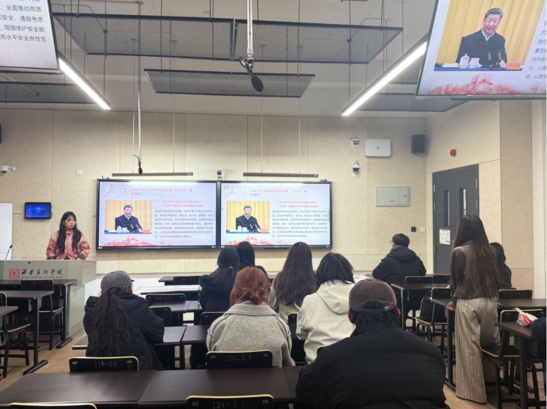 最后,郝海琴同学带领大家重温习近平总书记对青年的殷切寄语:“广大青年要坚定不移听党话、跟党走,争做有理想、敢担当、能吃苦、肯奋斗的新时代好青年”。她结合自身感悟谈到,有理想就是要把个人追求融入国家需求,敢担当就是要在关键时刻挺身而出,能吃苦就是要在学习实践中锤炼意志,肯奋斗就是要脚踏实地做好每件小事,这正是新时代大学生应有的青春姿态。