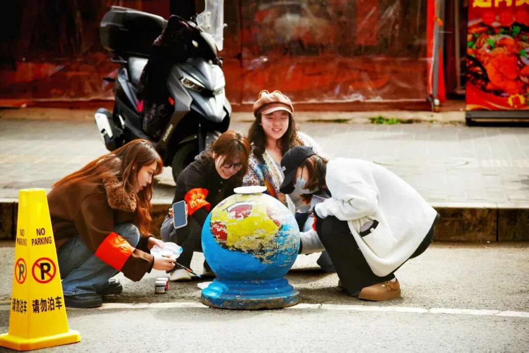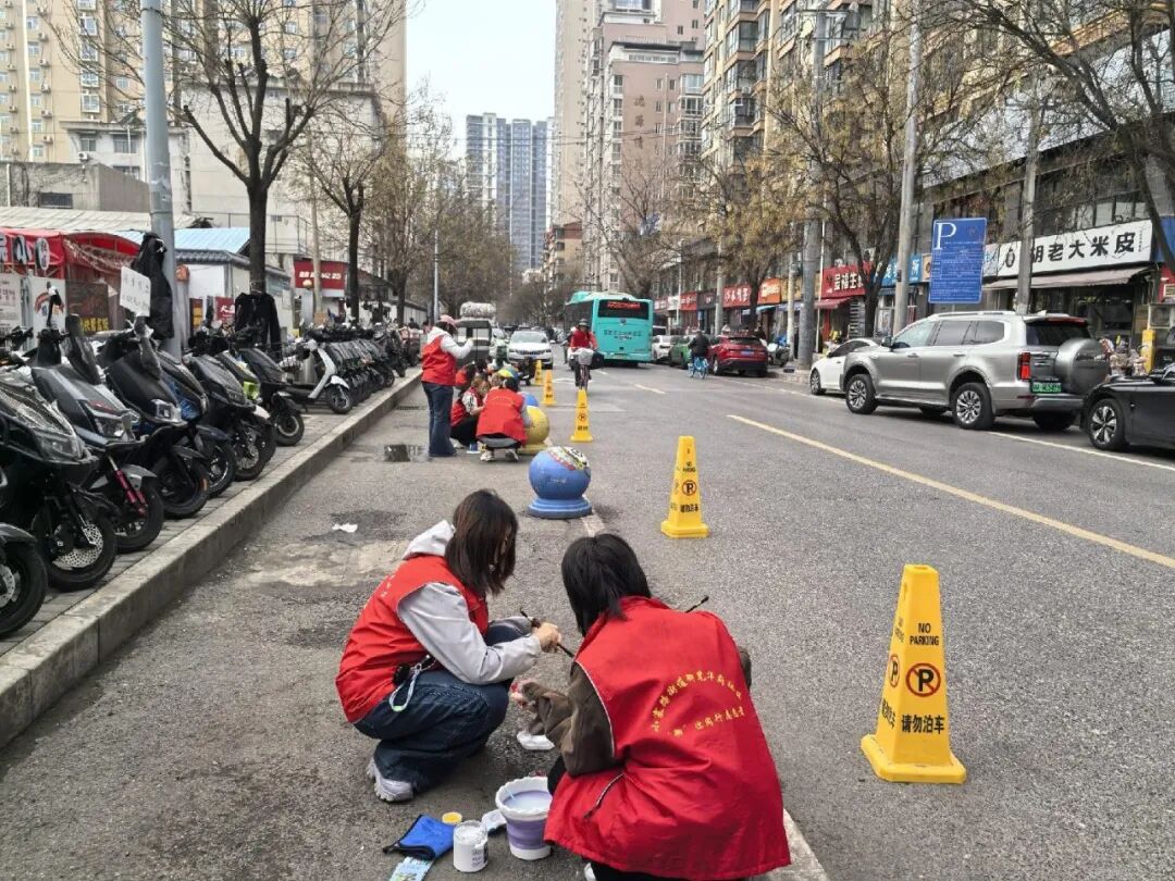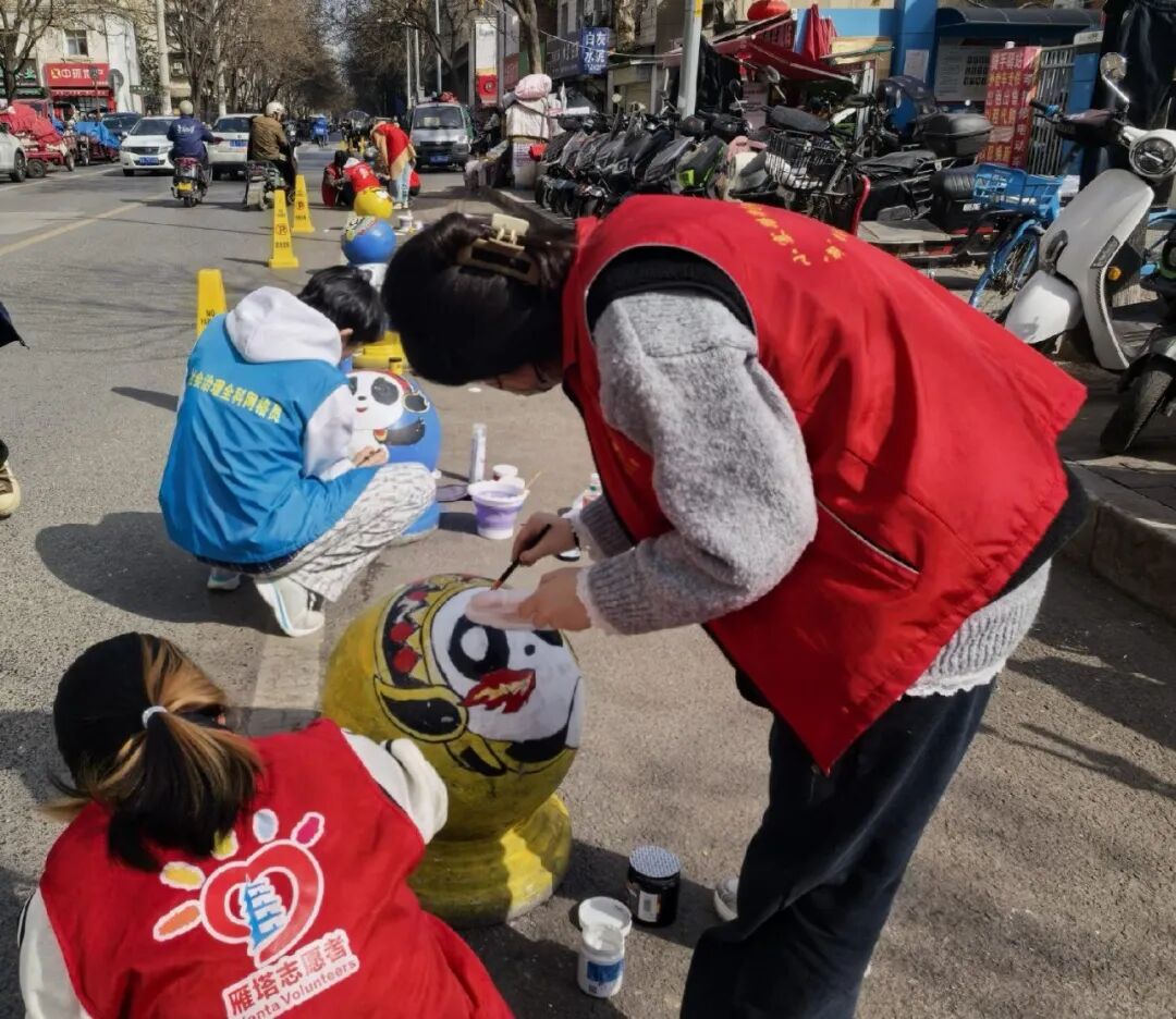 作为学院特色志愿服务项目,社区艺术美化环节备受期待。志愿者们充分发挥专业特长,精心构图、细致调色、认真勾线、均匀填涂,将原本单调朴素的石墩,逐一打造成主题鲜明、色彩明快的艺术作品。在同学们妙笔下,可爱的卡通形象、生动的非遗脸谱、温馨的文明标语依次呈现,让冰冷的石墩化身色彩斑斓、充满童趣的 “街头艺术品”。