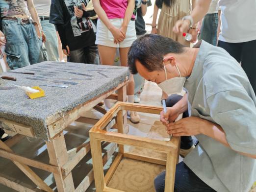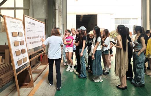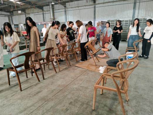 课程第一周在企业导师的带领下,以实地考察与技艺初探为核心,学生们走进源木禅家具厂,近距离参观传统家具制作车间,详细了解细工榫卯的16道制作工艺。从木材的醒木、挑料、开料、到开榫、组装、打磨,再到最后的表面处理,每一步都凝聚着匠人的智慧与心血。学生们亲手触摸木材的纹理,感受榫卯结构的精妙契合,为后续设计积累了丰富的感性认知。
