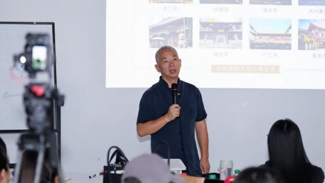课程第二周,源木禅董事长、非遗传承人、工艺美术大师冯宝安亲临课堂,带来主题分享讲座《非遗榫卯技艺与当代设计创新表达》。他深入浅出地讲解了榫卯技艺的起源与发展、产品在不同时期的演变与迭代、现代家具的设计理念,以及非遗技艺与当代设计巧妙结合的巧思。此外,还分享了作为设计师的工作流程,从灵感捕捉、方案设计到成品制作的全过程,让学生们对非遗榫卯技艺与现代设计有了更全面、深入的理解。