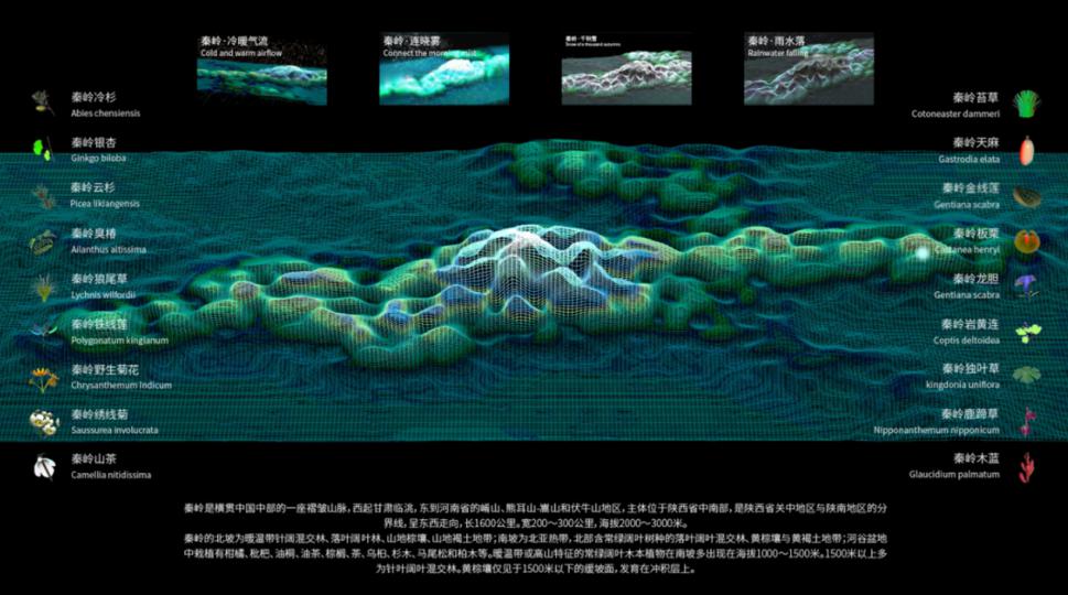 通过3D模型来展现秦岭植物的形状特征以及局部特地。手部移动可触发交互。通过分析植物的结构和形状特征的形象,用TouchDesigner建立系统进行交互。