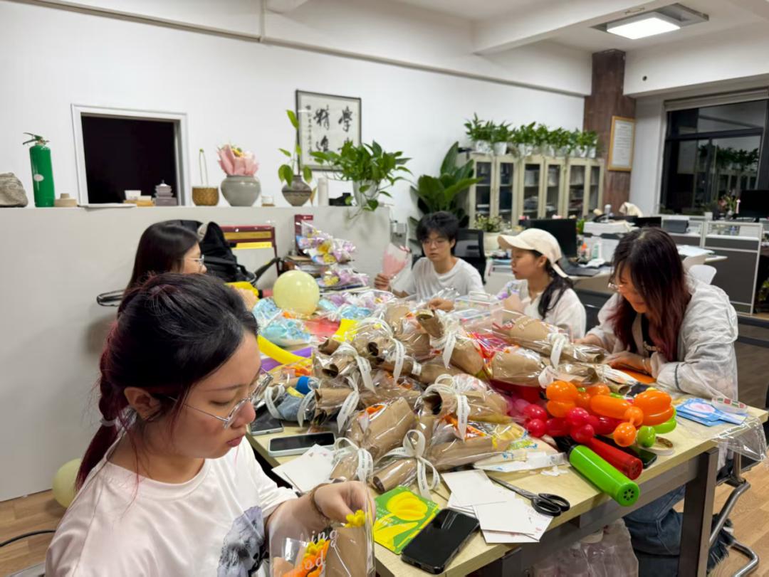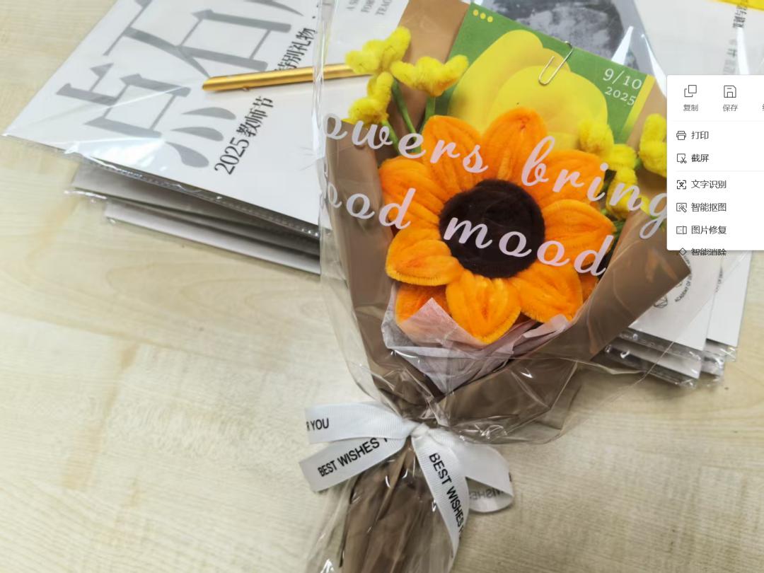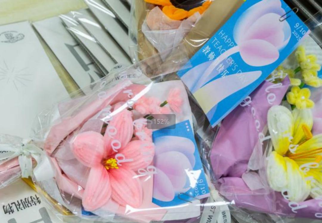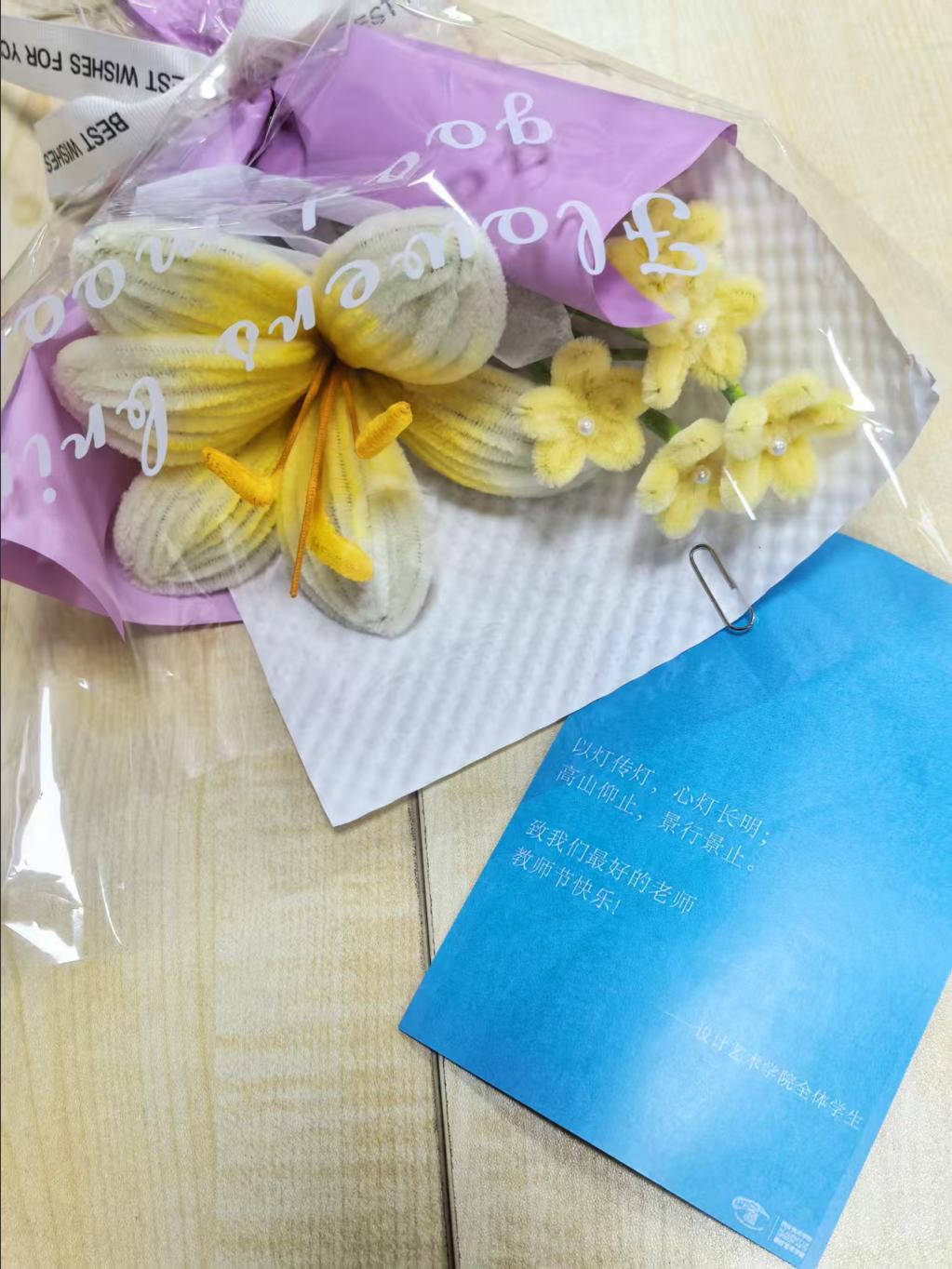 同学们还亲手制作了 “手工扭扭棒花束”,搭配上自己设计的花束贺卡,将对老师的敬意与感激融入每一个制作细节。扭扭棒在同学们的手中被赋予了生命,经过缠绕、塑形、搭配,变成了一束束造型独特、色彩鲜艳的花束。每一针每一线的细致勾勒,不仅耗费了制作者的时间与心血,更蕴含着对老师 “辛勤耕耘、无私奉献” 精神的细腻诠释,质朴的材料因心意而变得珍贵,手工的温度因情感而更能打动人心。
