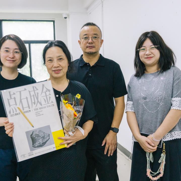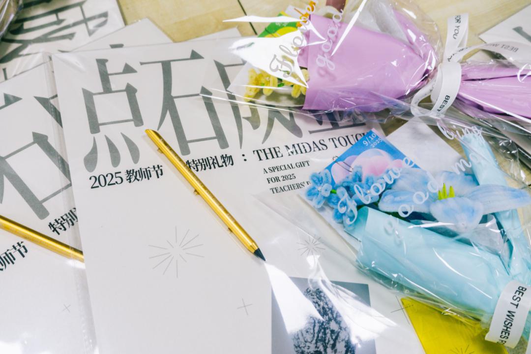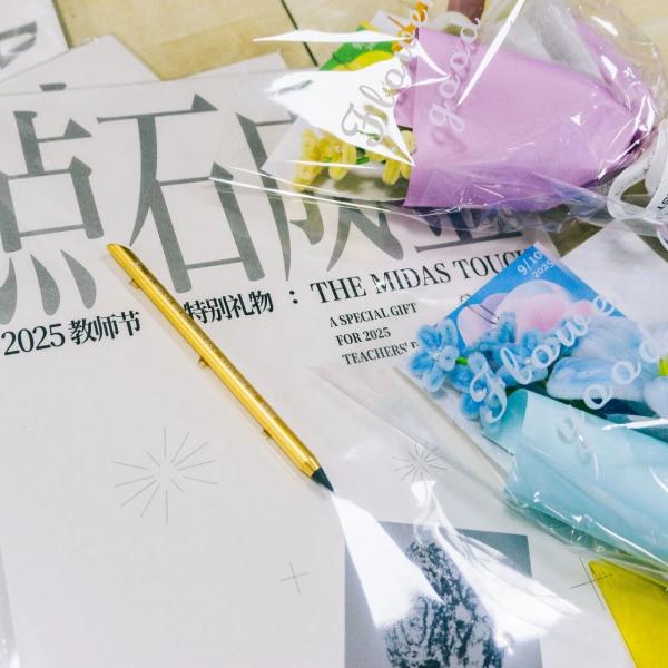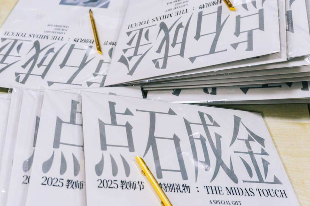 同时,学院以 “点石成金” 为意打造教师节专属礼物,表达对师者 “点化之恩” 的深切感念,这份礼物以 “金石之笔” 为设计灵感,学生在美院捡了100块石头,每一块对应一个编号,配上点金透卡,以有形之礼敬无形之恩,让老师的谆谆教诲与无私点拨,如同金石般被长久铭记,以金石之笔,向点化之恩永恒致意,让这份师生情谊在时光中愈发厚重。