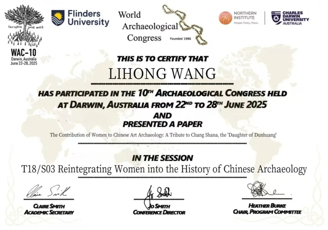 2025年6月22日-28日,西安美术学院设计艺术学院教授,中国艺术与考古研究所所长王丽红受邀参加在澳大利亚北领地首府达尔文举办的“10th World Archaeological Congress(第十届世界考古学大会)”Session: T18/S03 Reintegrating Women into the History of Chinese Archaeology(多重交叉视角下的女性与考古学),进行The Contribution of Women to Chinese Art Archaeology: A Tribute to Chang Shana, the \'Daughter of Dunhuang\'(中国艺术考古中的女性力量——致敬敦煌的女儿常沙娜)的论文宣讲。