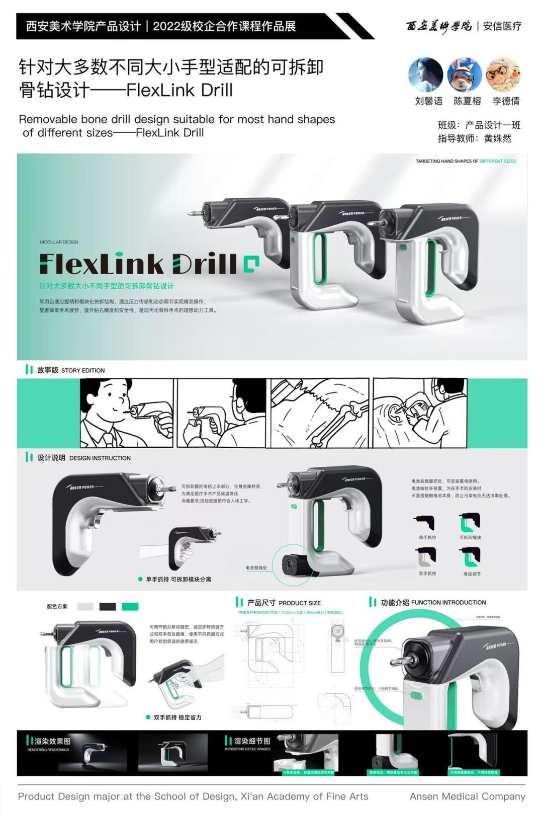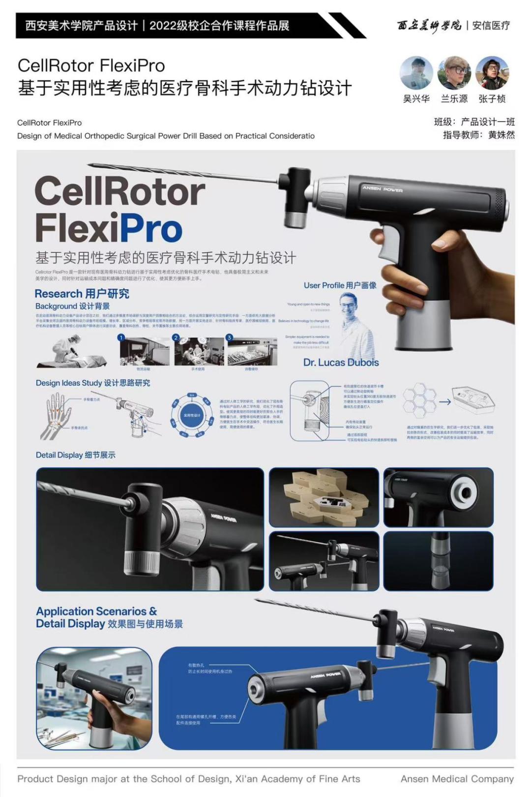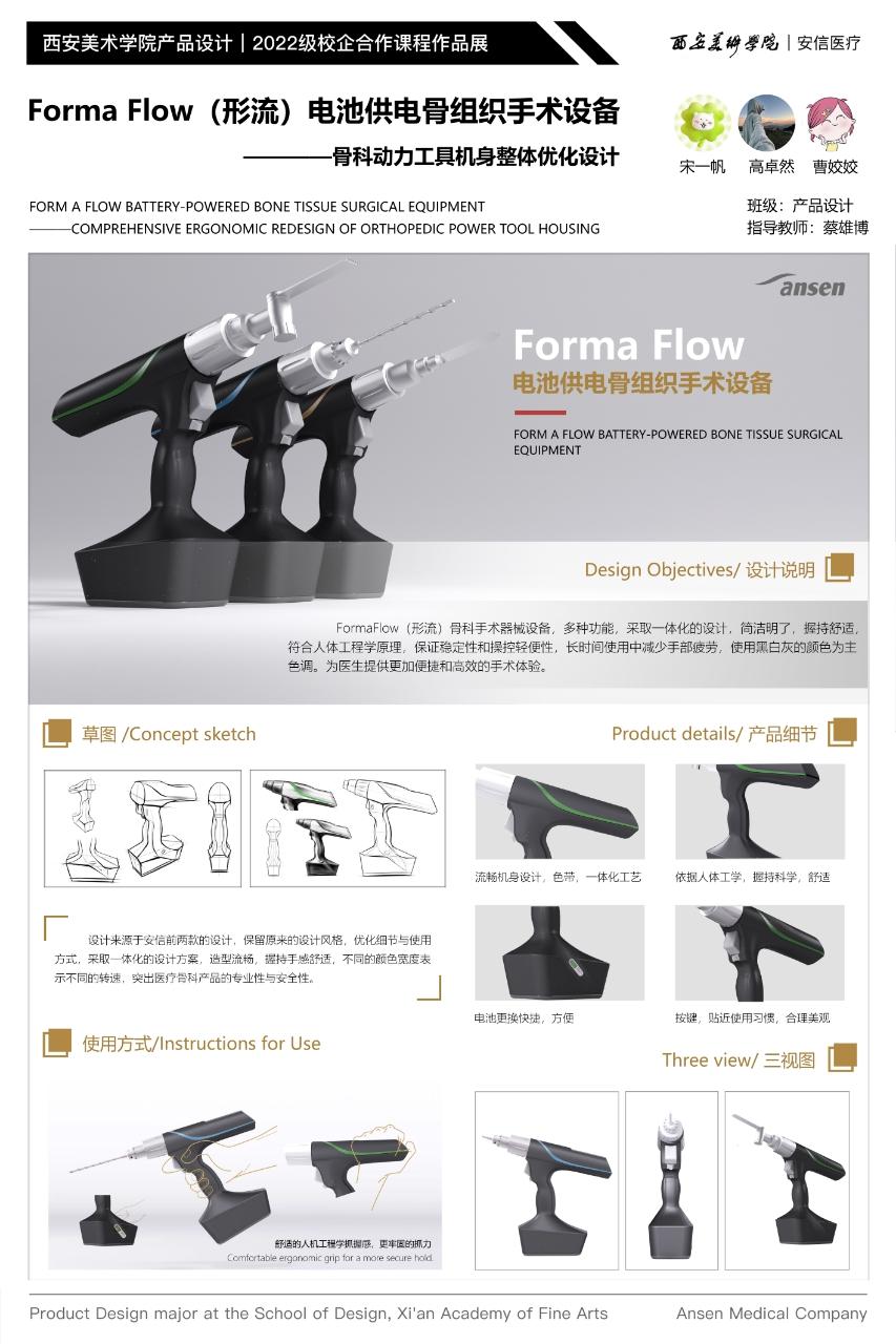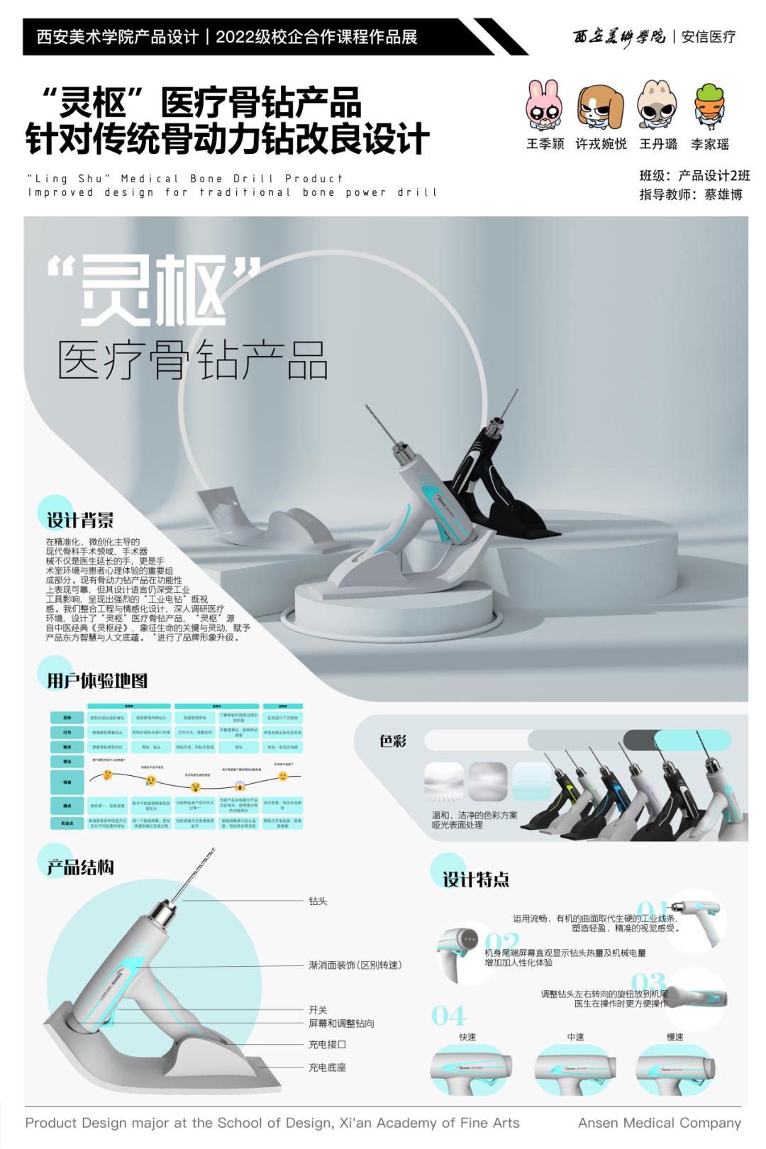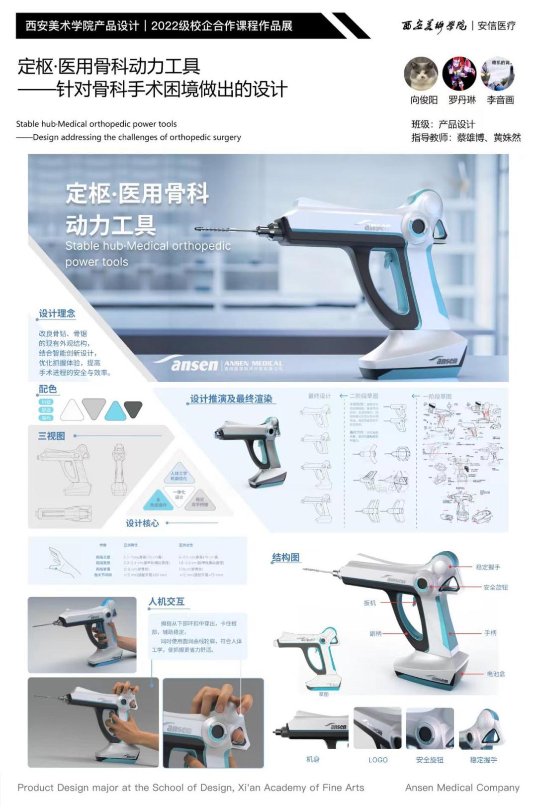 近日,设计艺术学院与陕西安信医学技术开发有限公司联合开设的“电池供电骨组织手术设备设计”校企合作课程圆满结课。本次课程历时四周(2025.6.9-7.4),聚焦医疗场景中高精度骨组织设备的结构优化与用户体验提升,面向产品设计专业三年级学生展开系统化教学与实践探索。