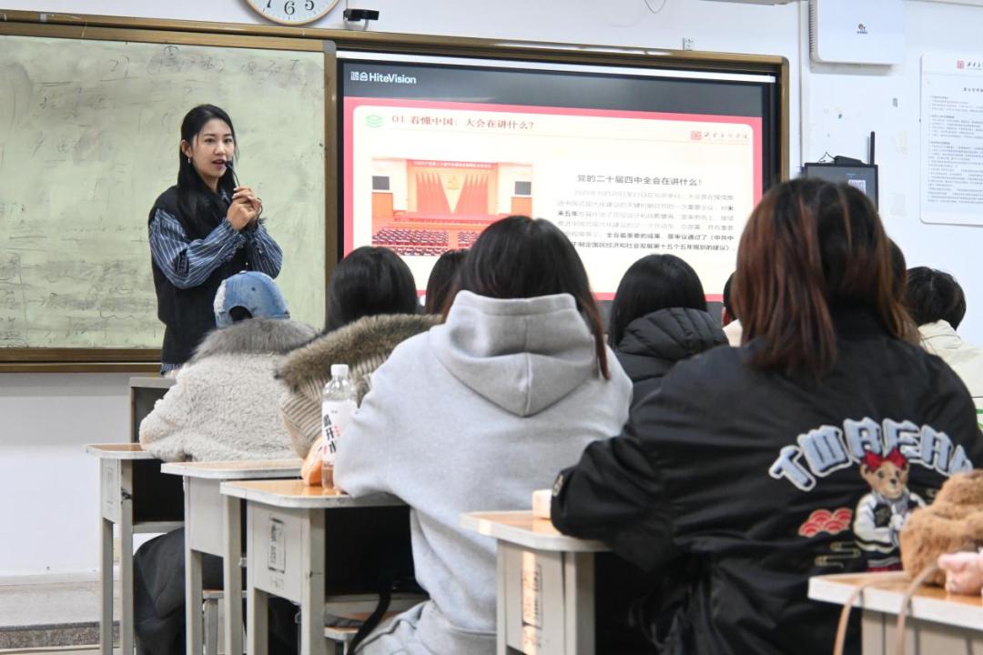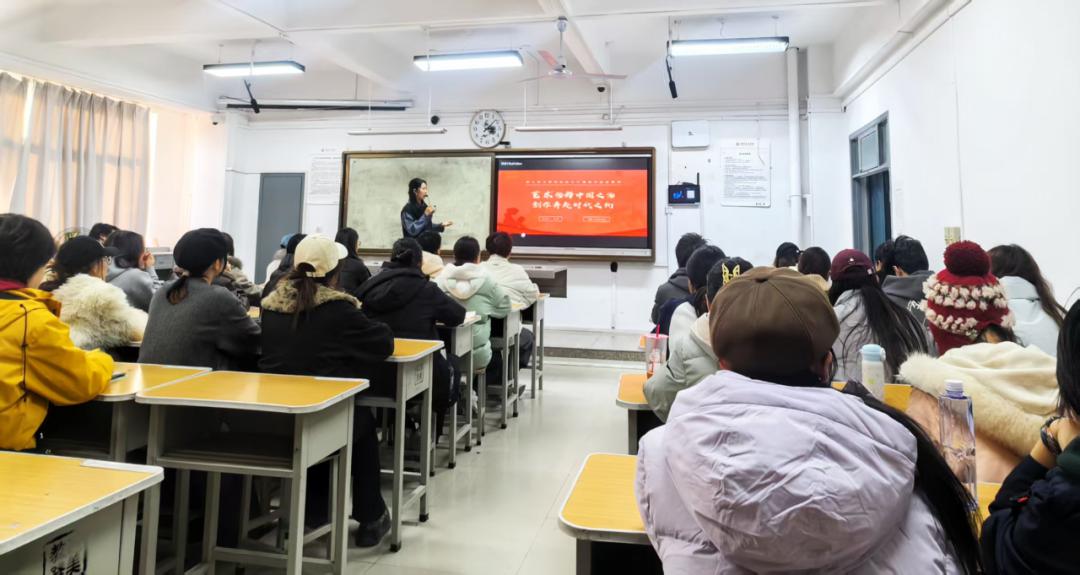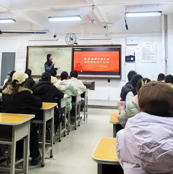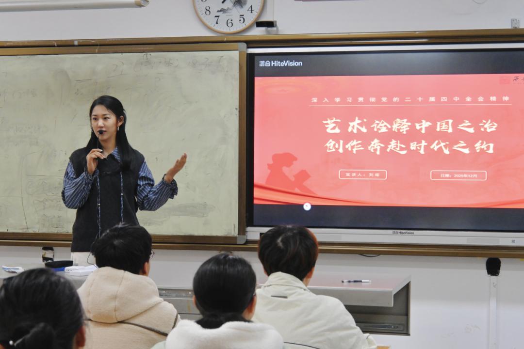 青春逢盛世,奋进正当时;深学悟精神,实干显担当。为落实学校党委关于深入学习贯彻党的二十届四中全会精神的部署安排,在设计艺术学院党委指导下,学院“青马工程”培训班于12月11日开展名为《以艺术诠释中国之治,创作奔赴时代之约——深入学习党的二十届四中全会精神》的专题授课。特邀西安美术学院党的二十届四中全会精神宣讲团成员刘瑶老师为青年学子系统解读全会精神核心要义,推动理论学习走深走实;读懂新时代发展密码,凝聚奋进 “十五五” 新征程的青春力量。