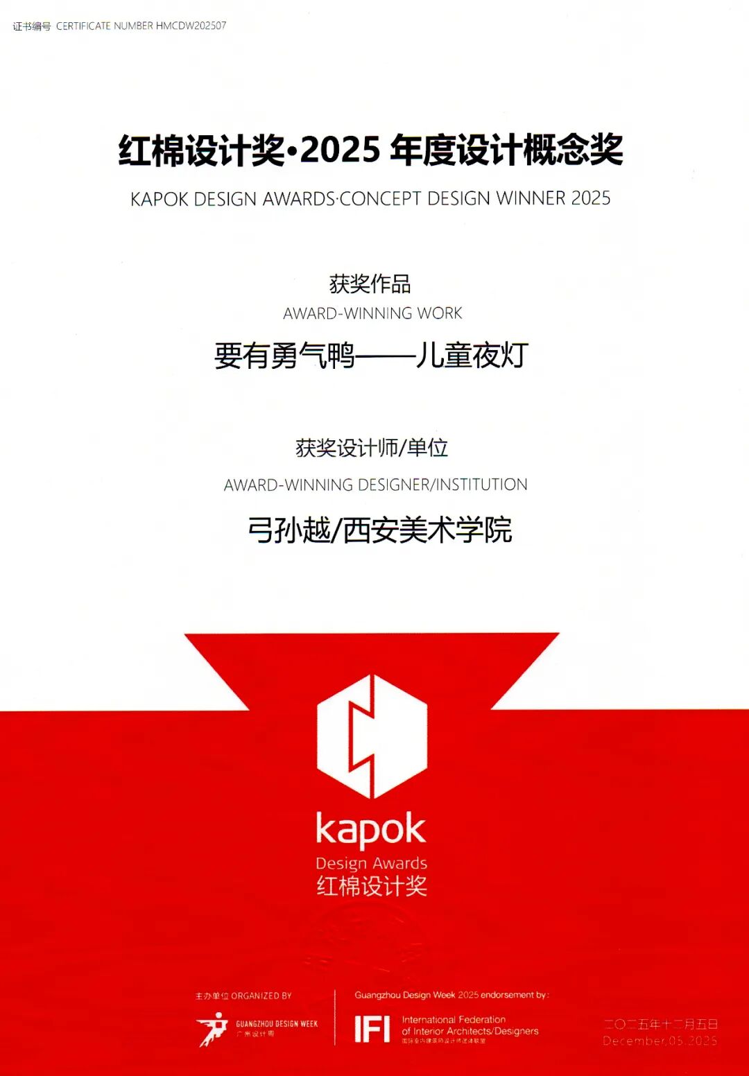近日,红棉设计奖・2025 设计概念奖获奖名单正式公布。设计艺术学院2025级产品设计专业研究生弓孙越凭借作品《要有勇气鸭——儿童夜灯》荣获该奖项。该作品从上海交通大学、浙江大学、北京理工大学等高校的众多参赛作品中脱颖而出,这也是学院学子首次获得此项荣誉。