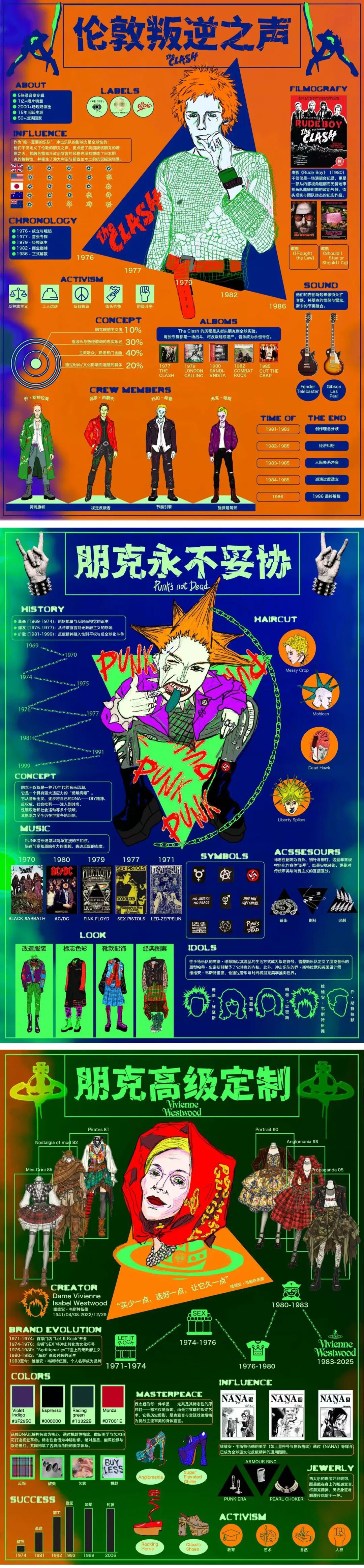 经典图案等具象元素,串联起朋克发展脉络,立体呈现朋克精神。设计风格极具张力与吸引力,大胆运用夸张的荧光色,搭配鲜明绘画语言,整体调性强烈鲜明;系列作品以橘色、蓝色、绿色为脉络进行拆解呈现,版面内容排布合理,逻辑关系清晰,既实现了信息的高效传递,又具备独特的艺术表达,是一份具有视觉冲击力的佳作。