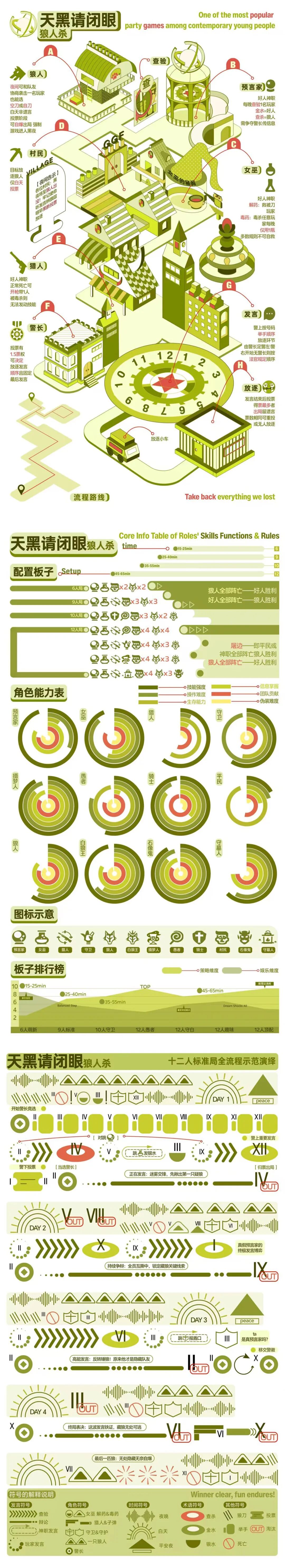 以年轻人熟知的狼人杀游戏为主题,完成了风格独特的可视化设计。作品清晰拆解游戏角色、角色能力与板子排行,更以符号化语言完整演绎12人标准局全流程——发言、角色、时间、术语等符号设计准确到位,将游戏过程直观呈现。这种以符号语言表现程序流程的尝试,是对前期叙事性表达的突破与挑战,既贴合年轻受众认知,又传达了可视化设计的创意与实力,是一份兼具趣味性与专业性的作业。