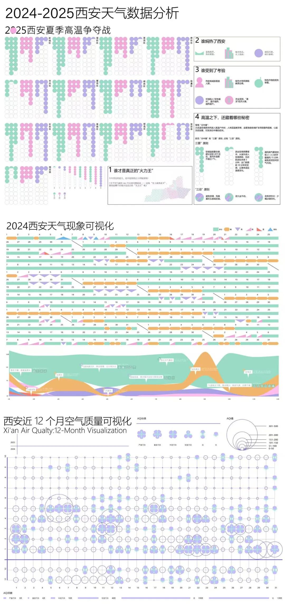 作品围绕2024-2025西安天气数据展开,通过“2025夏季高温争夺战”“2024天气现象可视化”“近12个月空气质量呈现”三个板块,构建了完整的数据分析表达。其最突出的亮点是采用独创性抽象符号语言,以高指代性的视觉设计传递数据变化,既体现了鲜明的个人思考,又赋予作品独特辨识度。色调清新柔和,主题信息清晰明确,主观化的色彩搭配成为作品风格的主要特征,是一幅兼具想法与质感的作业。