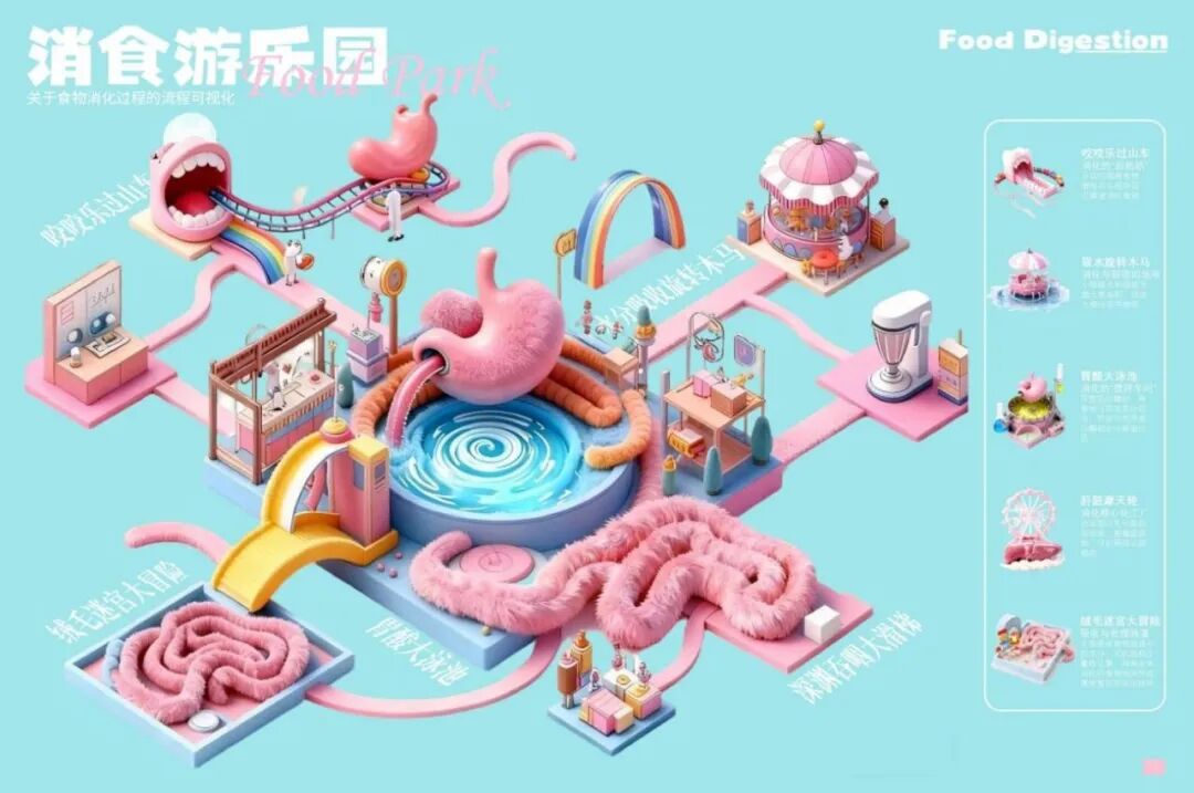 针对儿童进行的消化系统的知识科普。用游乐园来比喻消化系统的过程。