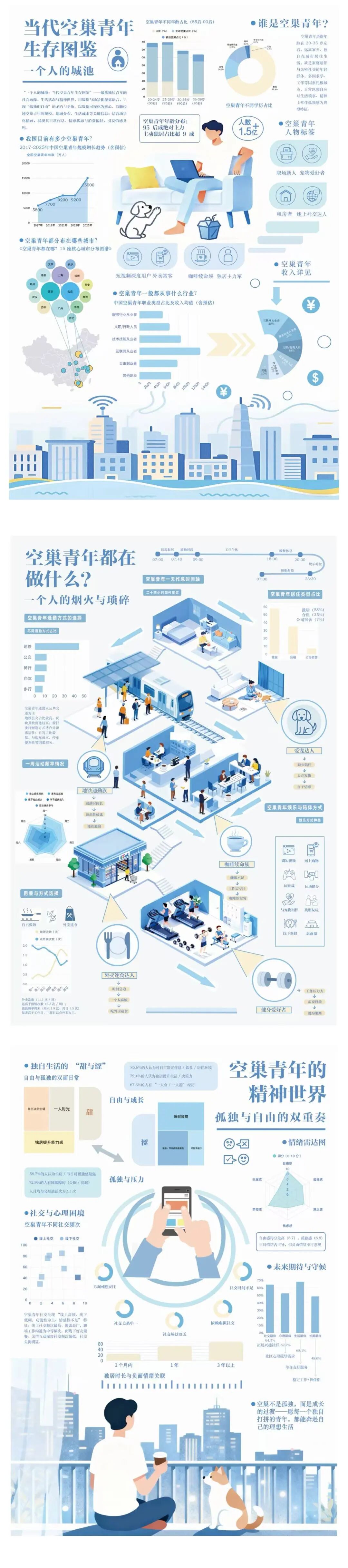 本作品聚焦“空巢青年”这一时事热点人群,以插画形式细腻呈现其日常状态、内心思绪与生活图景,兼具社会观察与人文思考。画面色调统一协调,插画风格自带亲切感,手法娴熟且信息传达层次清晰,主题明确突出,成功用可视化语言让社会热点话题引发关注和共鸣,是一份兼具温度与质感的优秀创作。